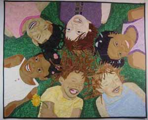 In 2006 I found a photo of 6 little girls lying in the grass, giggling. I was captivated by the photo and got permission from the photographer, James Levine, to use it. At that point, my skills weren't up to the task. In 2010, I was invited to make a quilt for a show on Racism, and shortly stumbled on that old newspaper photo. It made me grin and I thought that if we could overcome racism, this is what it would look like.